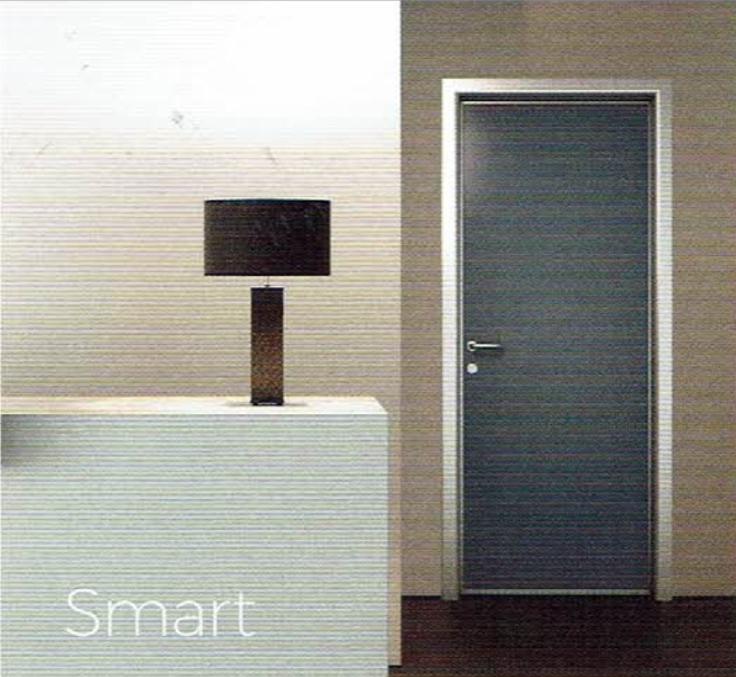 Battente realizzato con pannello laminato spessore 40mm. Anta con profilo minimale estruso in alluminio verniciato rai o tinta legno. Guarnizione di battuta e serratura patent di serie.
